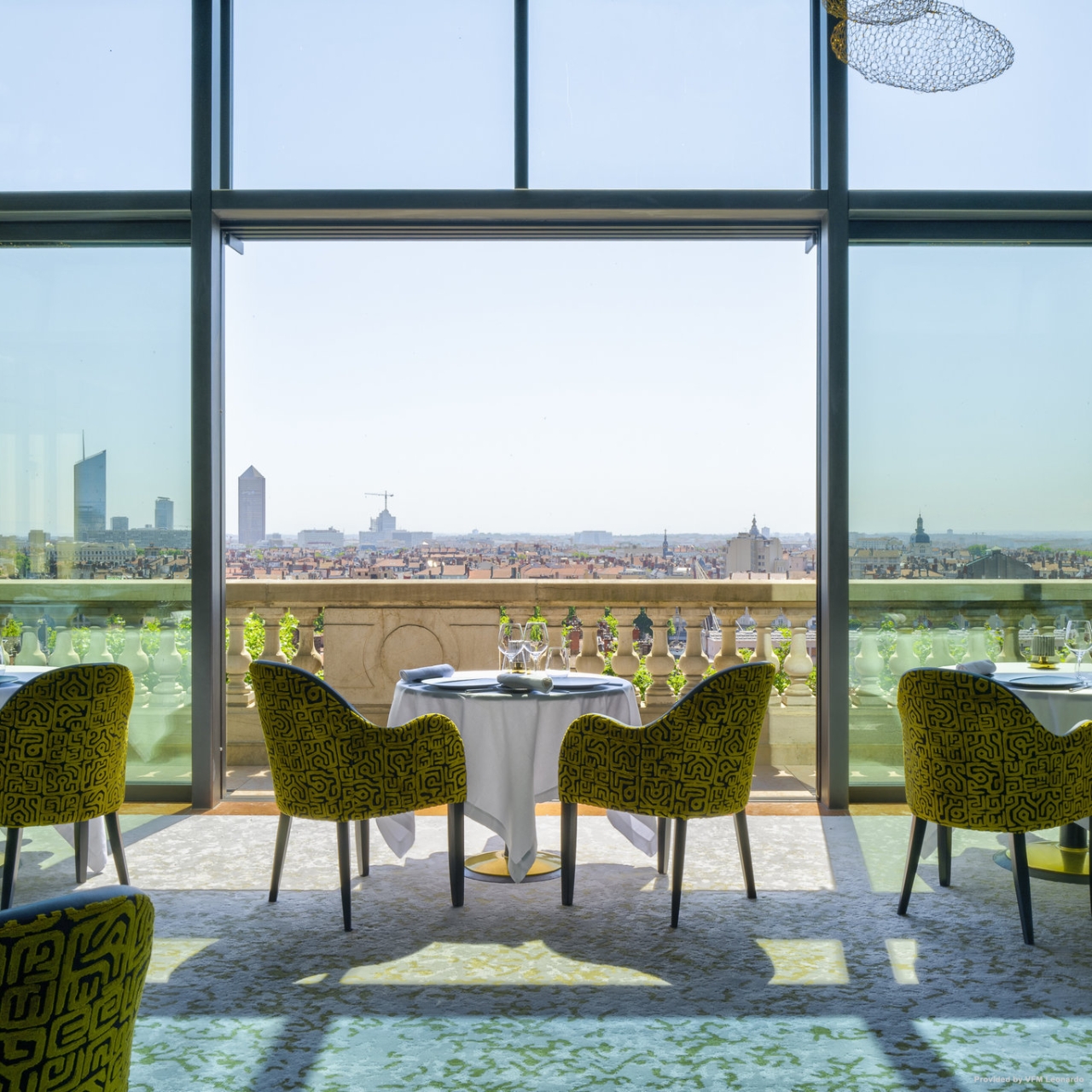 Terrasses de Lyon Michelin starred restaurant at La Villa Florentine Fourvire Lyon. A haven of peace in the heart of Lyon majestically dominating the city from the Fourvire hill the former 17th century convent is converted into a 28-room 5-star luxury hotel designed. Villa Florentine displays exceptional decor reflecting its rich past and Italian-influenced splendour.